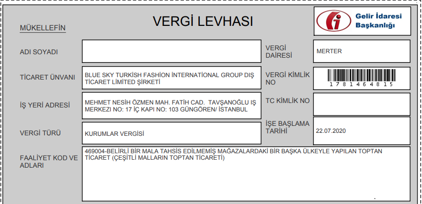“Blue Sky Turkish Fashion International Group Dış Ticaret Limited Şirketi”.